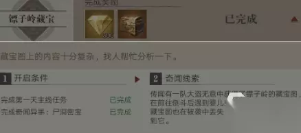 这个宝藏图就是第一条线索,完成这条线索的获取后接下来就可以来获取第二条线索了,这第二条线索的获取需要玩家等级先来到30级,这需要花费一些使劲按然后需要完成和这一张有关系的主线,这个主线就是镖子岭地区主线。