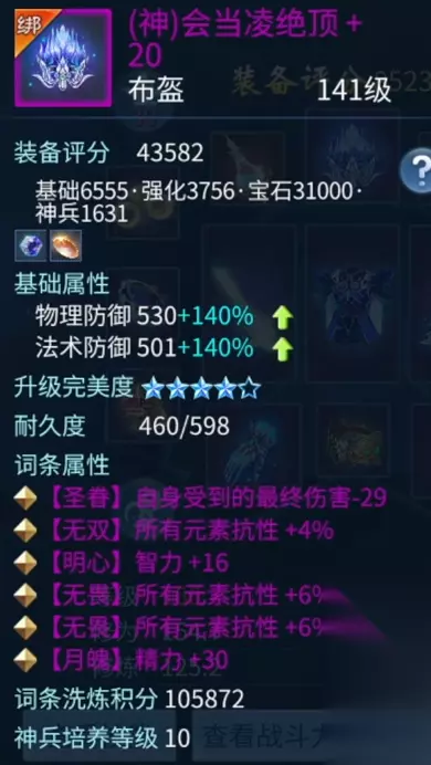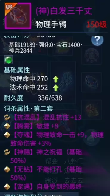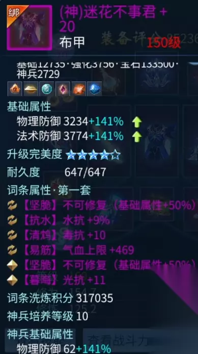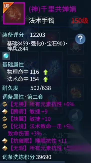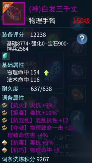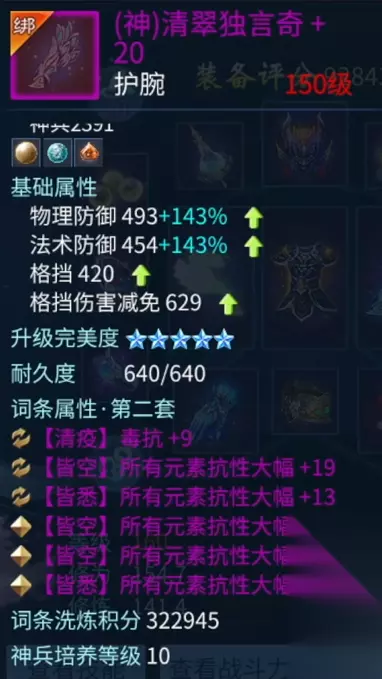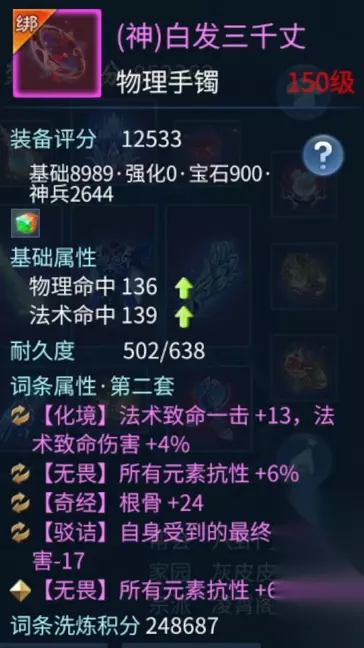 柳月影 两个手镯也都是双条元素抗性百分比。有一点需要额外介绍的是,我很多的神兵属性洗的都是抗致命,目的很简单,都是为了更好的保命,增加自己的生存空间。 衣服也是双 50 的属性提升,外加元素的各种抗性。