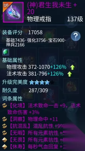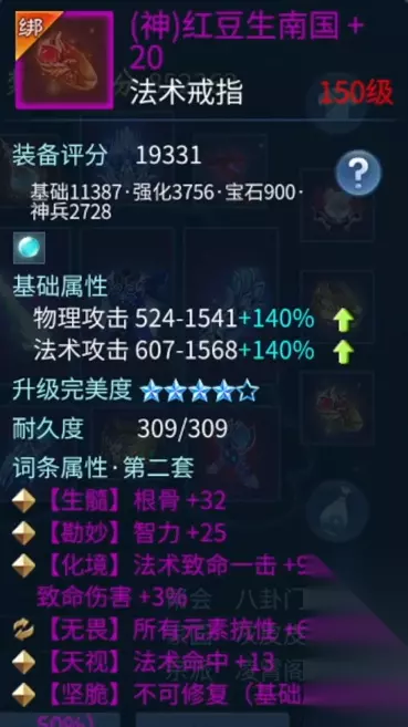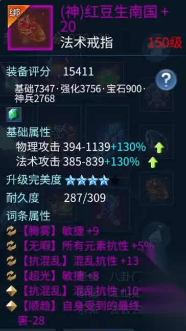 柳月影 戒指的词条和我的核心思路一样,虽然这样的选择攻击力会低一点,但能加不少的元素抗性,保证了方士在场上的存活,然后靠着忽视来打伤害。降低攻击力,提高元素抗,是一个非常有性价比的选择。 所以这也是我打团的时候不怎么选择双 50 的攻击戒指的原因。想输出,先生存。