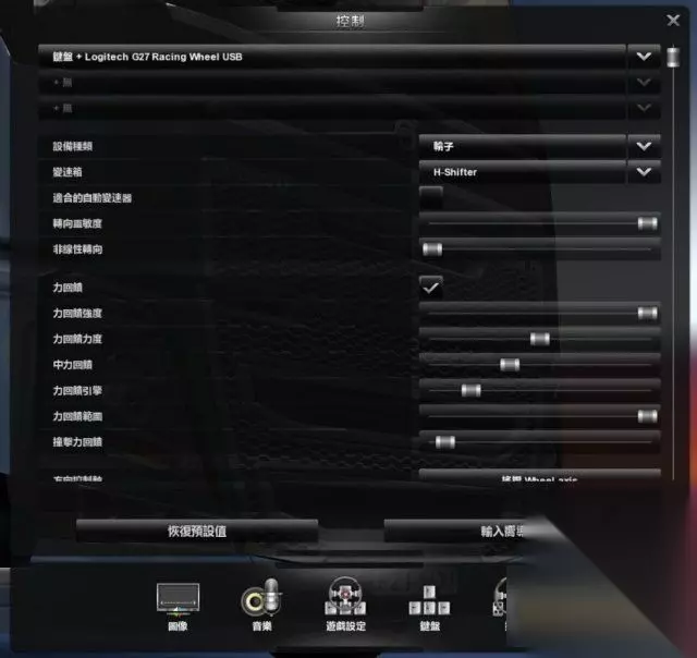 首先在游戏里选择你的G27 将力回馈打勾 转向灵敏度 直接拉到最右 非线性转向 最左 不然盘子会有延迟 (话说1.9.3版终于把翻译修正了) 力回馈强度: 我习惯拉到最右 也就是最大 力回馈力度: 中 中力回馈: 不建议开太高,不然过弯打盘需要很大的力,具体手感可以自己调节. 力回馈引擎: 也不建议开高 因为强度和范围已经拉到最大 这个开高了盘子震得太厉害. 力回馈范围: 拉到最大 撞击力回馈: 强烈建议拉小,保护盘子,拉大了不小心撞到护栏就听你的盘子使劲的咔嚓吧. 力回馈每个人的感受会不同,这个得花点时间调节一下,欧卡2的力回馈做得很一般,我也没开过真的卡车,只能凭感觉调出我自己绝得比较真实舒服的参数. 然后是档位的分配.G27在欧卡里有三种档位的选择.我个人喜好第一种.比较接近真实.
