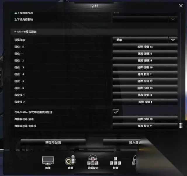 先从方向盘上六个红色的按钮起 左边三个 依次往下是 向左看 车灯 远近光灯切换 右边三个 依次往下是 向右看 向中看 喇叭 手排上的按钮 四个黑色按钮 分别是 引擎启动 双闪灯 手刹 雨刷 十字键按钮 我设置了 四个不同的视角 驾驶室视角 头伸向车窗外 等等 四个红色圆按钮 从左往右 分别是 高低档位切换 收音机 拖车悬挂 等等 顺便吐槽下罗技G27的驱动程序,我不是很喜欢用驱动自带的添加游戏来单独为游戏设置一套力回馈调节的方案, 我试过这样在游戏里经常会莫名的失效不稳定.所以建议各位调好自己觉得舒适的参数后截图一张保存. 以上就是我的个人设置,仅供大家参考。