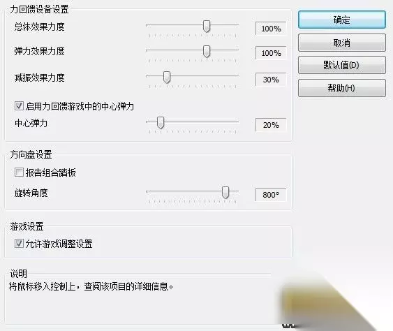 总体效果力度: 100% 弹力效果力度: 100% (貌似这个调多调少影响不是很大) 减振效果力度 30% (这个参数影响卡车在未发动的情况下原地打盘的阻力.越大越难转,不建议太高) 中心弹力可开可不开,因为在行驶过程中方向盘也是会自动回正的.如果开的话不建议高于20%.如果高了在卡车原地打盘的时候也会回中,这样不现实. 旋转角度: 800度 (欧卡2里的卡车方向盘角度大概是790-800度 经过我仔细对比 800度正好能和游戏里同步.具体自己感受) 组合踏板的勾取消掉 然后勾上允许游戏调整设置. 接着是游戏里的力回馈设置: