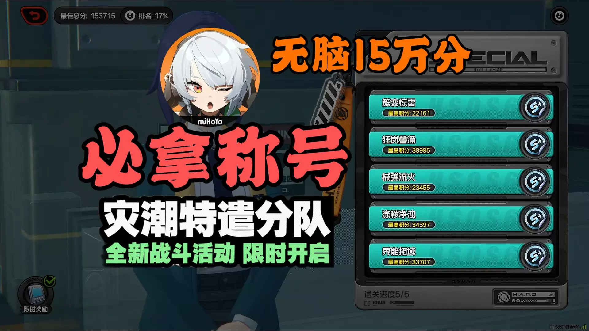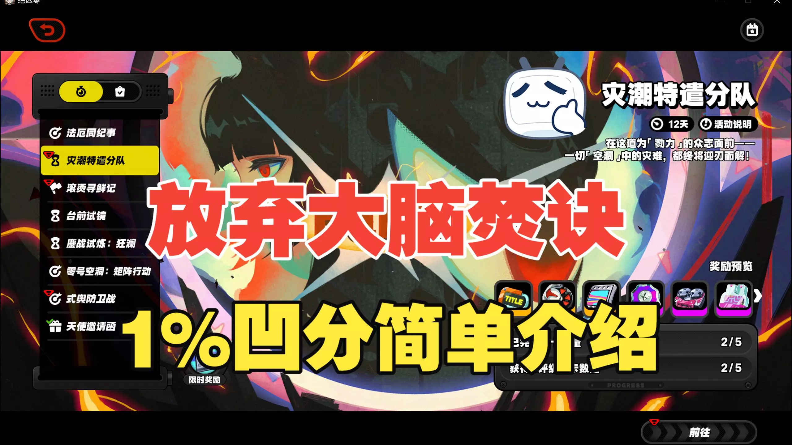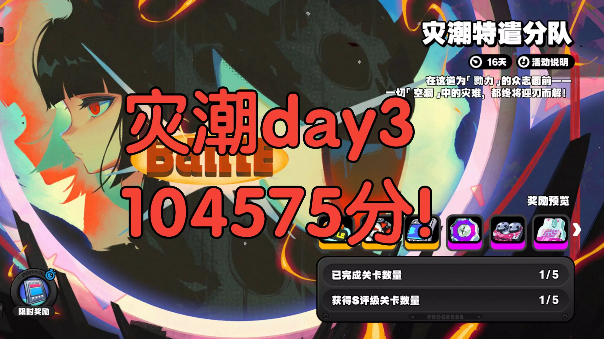 这是《绝区零》灾潮特遣分队活动的打法攻略,给出了5关通用配队卢西娅+仪玄雅+照、嘉音+叶瞬光,还分享了冲0.01%排名的条件,以及切队获取能量、战场队伍限时40秒等提分小技巧,助力玩家冲榜。