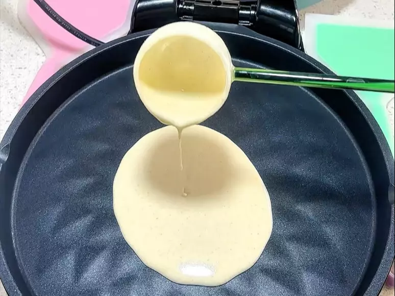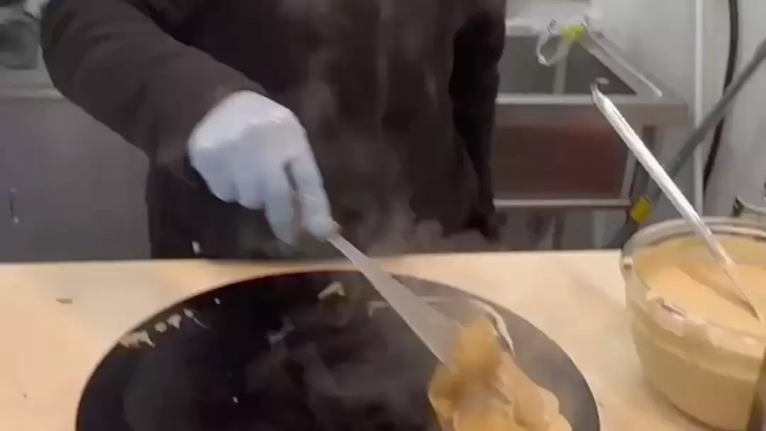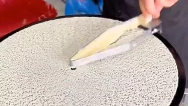 这是临沂特色小吃培训的摊煎饼手法教学,展示了用刮板将面糊在鏊子上摊开的丝滑烙煎饼手法,教大家掌握摊煎饼的技巧。