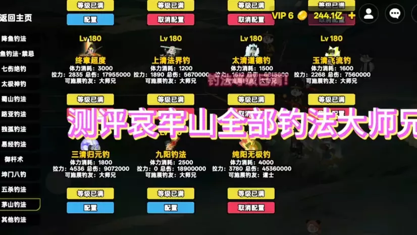 这是一篇游戏内的哀牢山新钓法测评,展示了茅山钓法下的终章超度、上清法界钓等多种钓法的属性、升级条件,还呈现了使用这些钓法在哀牢山钓取无名怪鱼、小白条的实战过程,为玩家提供钓法参考。
