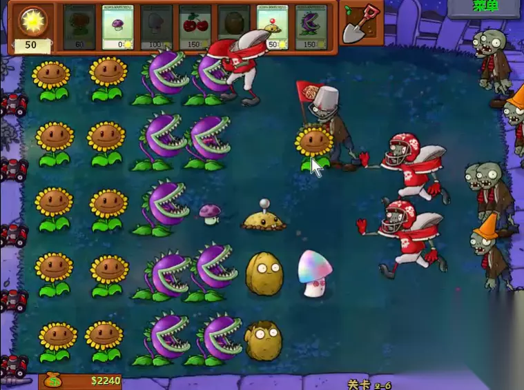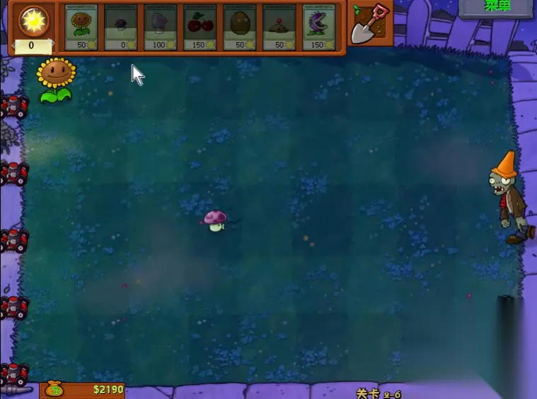 2-6关是一关夜晚场景的关卡,没有自然阳光掉落,同时需要应对铁桶僵尸和报纸僵尸等高强度敌人的快速进攻,通关核心在于快速建立阳光经济并构建稳固的防御阵型。开局必须优先并持续种植阳光菇来保证阳光供应,建议在第一列集中种植以快速积累资源,同时要立刻使用墓碑吞噬者清理场地上的墓碑,防止僵尸从后方出现并腾出种植空间。初期防线可以依靠免费的小喷菇过渡,并尽快将其升级为大喷菇来提升火力,将大喷菇布置在第三列左右的位置作为主力输出。