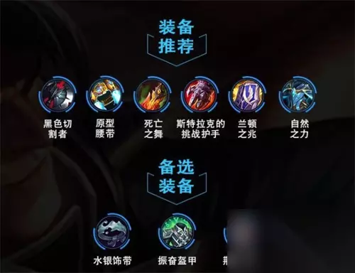 总结,由于德莱厄斯被动技能血怒的存在,并不需要多少输出装,前中期有一件黑切就足够了。此后,以增强自身坦度为主要目标,对面AD伤害高就出反甲兰盾;AP输出高就出绿甲。其他视场上具体情况而定。