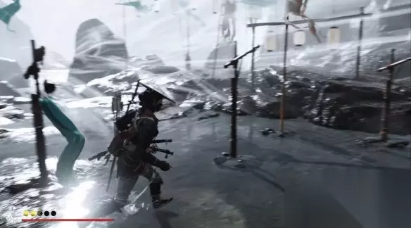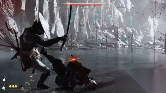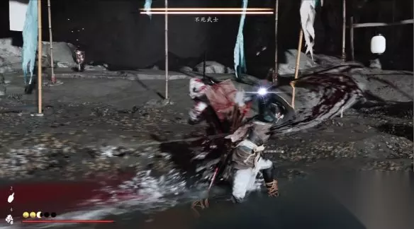 与现身的不死武士决斗,不死武士会使用火刀,然后经常会出蓝色招式,这时我们可以在即将受击前使用格挡招架然后反击。