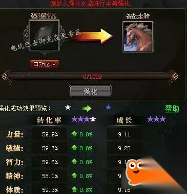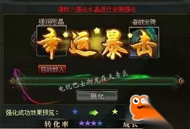 打开马匹界面,在转化率星级的旁白有个加号,点开就会出现如上界面,界面打开后,可以看到有一个放入强化水晶的框,我们把水晶放上去哟!