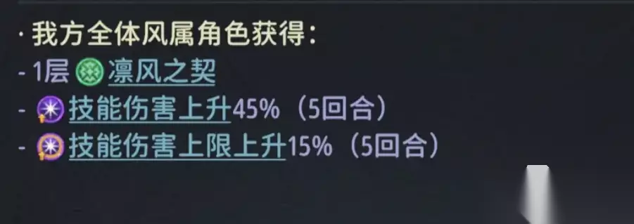 目前的风阵容组成比较容易,法师主角+兰朵莉亚+米蒂尔+弗洛拉这四名名角色就够了。兰朵莉亚主要是依靠“凛风之契“来打输出。兰朵莉亚在第一回合可以获得一层的“凛风之契“,另外两个队友分别可以帮忙叠一层“凛风之契“。通过消耗累积的“凛风之契“,来增加技能的释放次数。当兰朵莉亚叠满5层“凛风之契“,再次释放技能的这个伤害是非常高的。