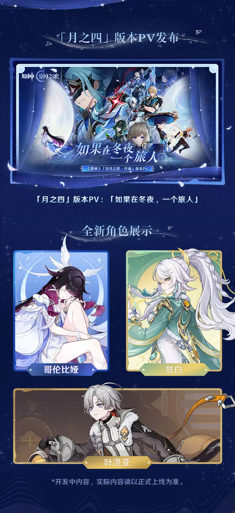 感谢各位旅行者的支持与陪伴,我们将为大家带来更多「『空月之歌·终曲』如果在冬夜,一个旅人」版本的最新消息~
