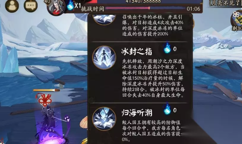 海甬道技能分析:冰封之指,先机释放攻击我方阵容攻击最高两个式神。当玩家获得高额治疗则会自动解除,并提高伤害。冰封状态下,式神每回合损失高额生命值。小编建议玩家这里携带SP大岳丸,其本身队友死亡后可解锁变身,抵抗一切控制效果。安魂冢技能分析:飞浪,全体伤害技能,同时可以击退我方行动值。归航之帆,召唤物被击败后,会立刻召唤下一批召唤物,该技能可能导致我方无法进行下一步攻击就全队阵亡。冲锋,对敌方攻击最高目标造成伤害,并降低伤害。对此玩家需要上阵拉条式神,并保持好队伍速度,才能防止快速被击杀。