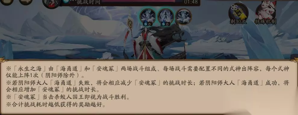 对于这次永生之海第三层boss技能解析: 本次挑战分为两个阶段,第一阶段为海甬道,第二阶段为安魂冢,两个阶段敌人的技能不一样,且需要切换阵容式神不可重复上阵,这也意味着玩家需要上阵12个式神。海甬道攻打成功则会增加安魂冢的攻打时间,失败则减少。玩家顺利通关安魂冢,才可算永生之海第三层顺利通过。