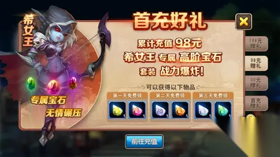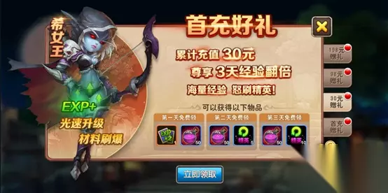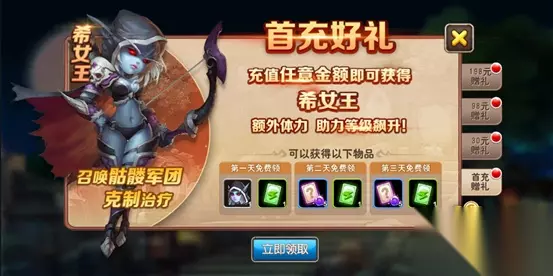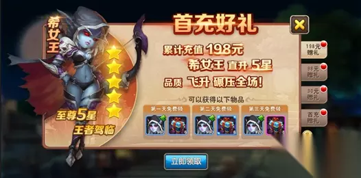 1.充值任意金额 1块,每日超值礼包。冲到就是赚到。希女王、三天体力卡、10连抽,直接到手! 性价比最高,没有之一。请叫我红领巾!
