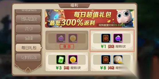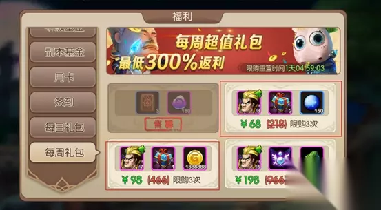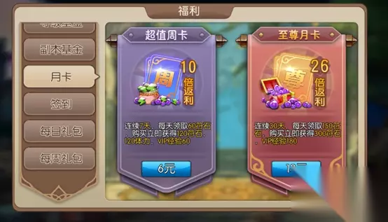 周卡+月卡+每日礼包。绝对是超级划算,极高性价比,不但可以无压力升级英雄,而且还可以获得双倍经验卡,精英副本重置券。这在游戏初期对玩家的成长都收益极大。 每日礼包中的许愿券更是可以在以后的指定卡牌抽取中用到,性价比极高。