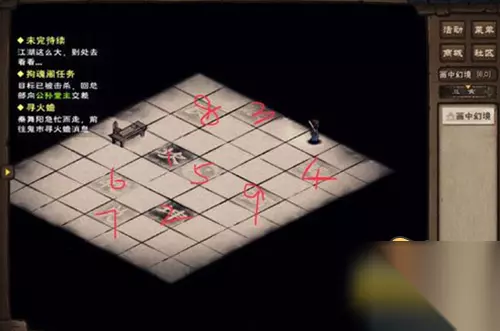 画中幻境一共有九个阵位,九个阵位要按顺序走,如果顺序乱了,或者我们连续踩了两次都是不可行的,所以一定要有一个正确的顺序才能走出去。