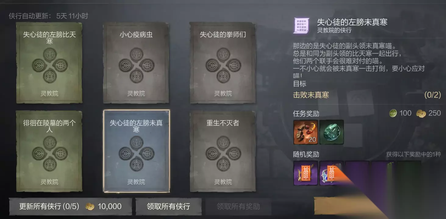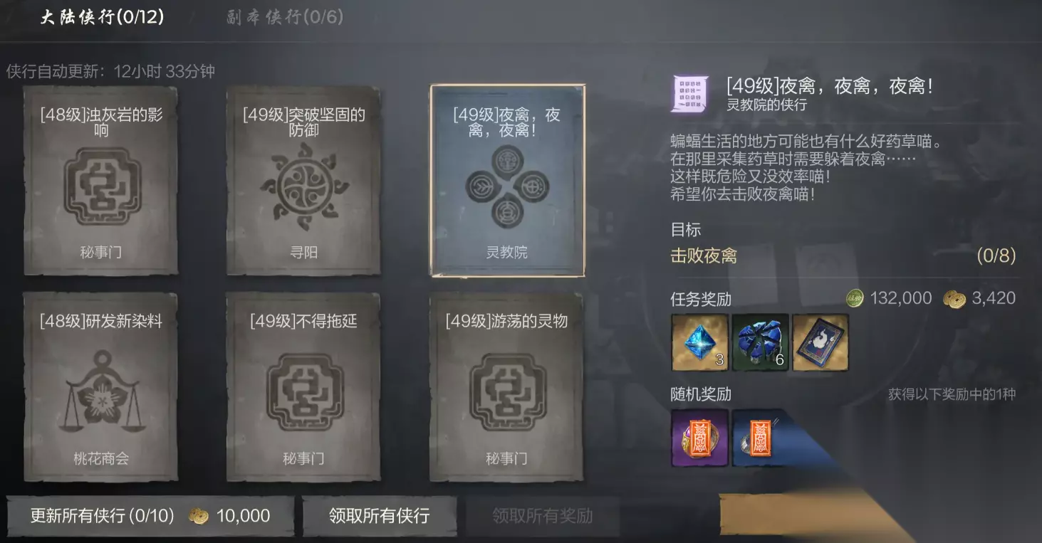 1、侠行任务 侠行任务大家可以理解为每日任务,每天4点时会刷新,每人最多可以接取12次,这些任务大多是一些重复性任务比较简单,完成能获得经验值、抽卡道具和养成材料等道具奖励,任务品质越高级奖励还会越丰厚,当任务品质较低时,玩家可以用金币来刷新,这将有机会刷新出更高品质的侠行任务。