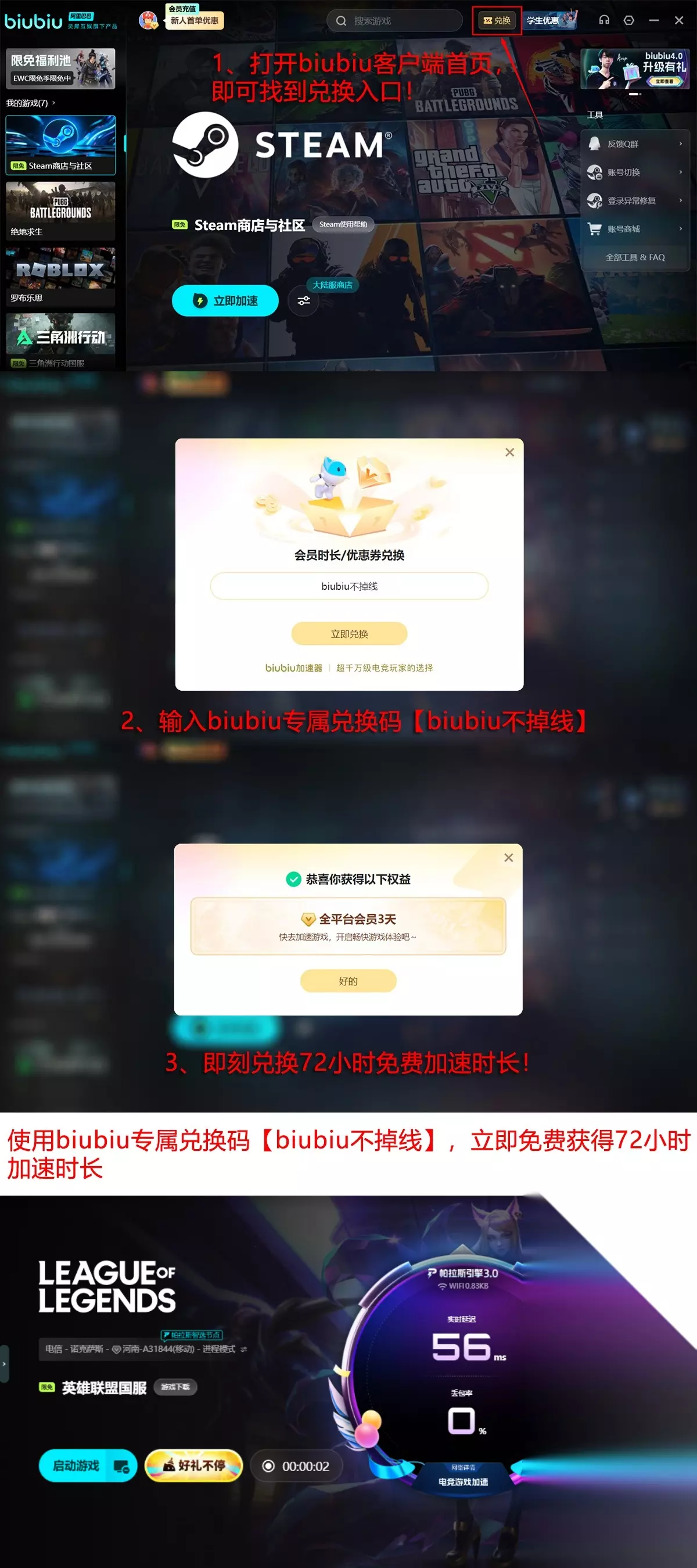 完成账号注册后,用户可立即获得首日全功能免费试用权益,时长为24小时;另输入激活码【biubiu不掉线】,即可额外解锁72小时职业模式加速权限。两项福利叠加使用,总计可连续享受四天专业级网络优化服务。