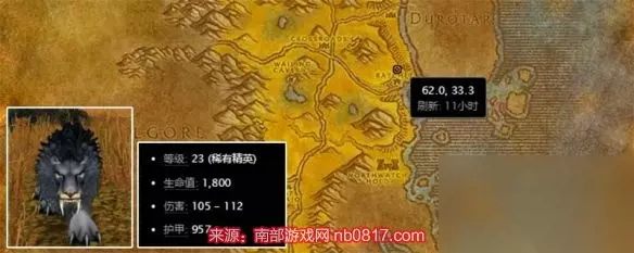 魔兽世界狮王修玛刷新位置与时间解析 一、刷新位置 1、 位置描述:狮王修玛位于贫瘠之地的棘齿城北侧,具体坐标为(62.0,33.3)。 2、 技能特点:狮王修玛拥有独有技能“疾痛术”,使技能目标受到的物理攻击伤害提高。 二、刷新时间 1、 狮王修玛的刷新时间为12个小时。 2、 计算方式为从上一只修玛被击杀或捕获之后开始计时。