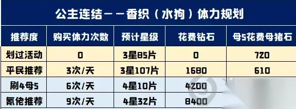 下图为全体力刷活动碎片预测,但是在活动期间还包含n二和心碎翻倍两个活动,大家如果要参加这两个活动的话,需要额外增加自己的体力。