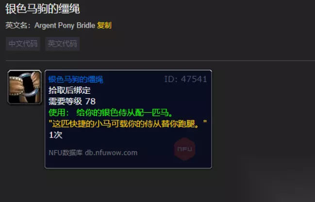 银色马驹的缰绳属性 物品等级: 78 拾取后绑定 消耗品其他 {loop Array }{/loop} 需要等级: 78 使用:给你的银色侍从配一匹马。 "这匹快捷的小马可载你的侍从替你跑腿。"