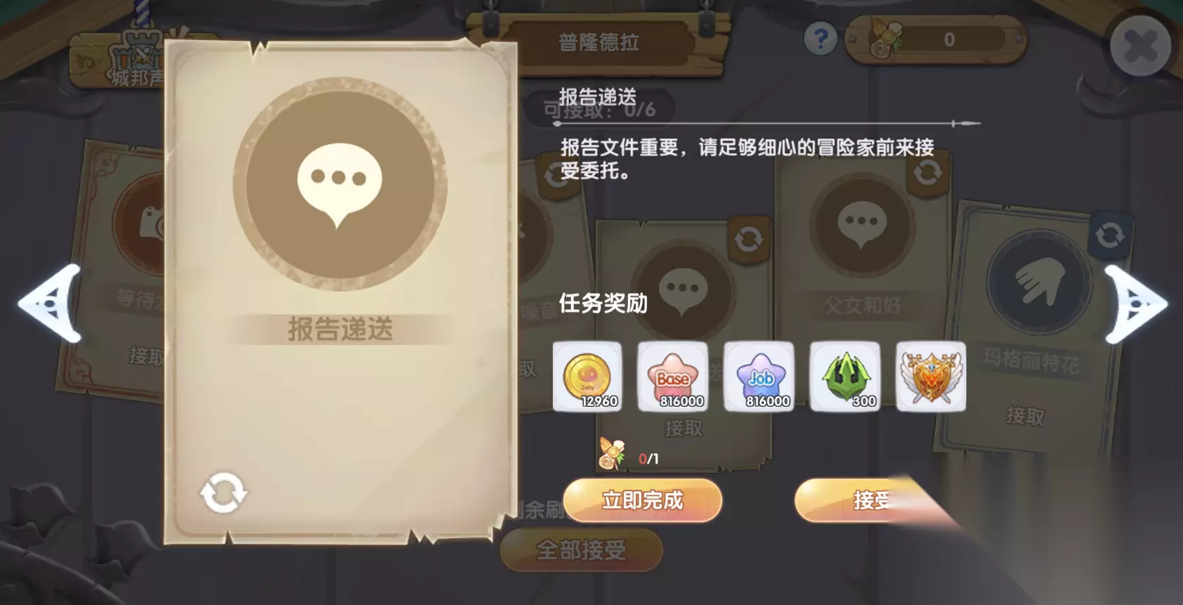 1、委托板任务 每日委托每天可以接取6个,每完成一个可以获取300点奥丁的祝福。完成当天的全部委托,可以获取1800点奥丁祝福。 委托板任务有品质之分,但品质只影响对应城市的声望多少,不影响奥丁的祝福的获取。