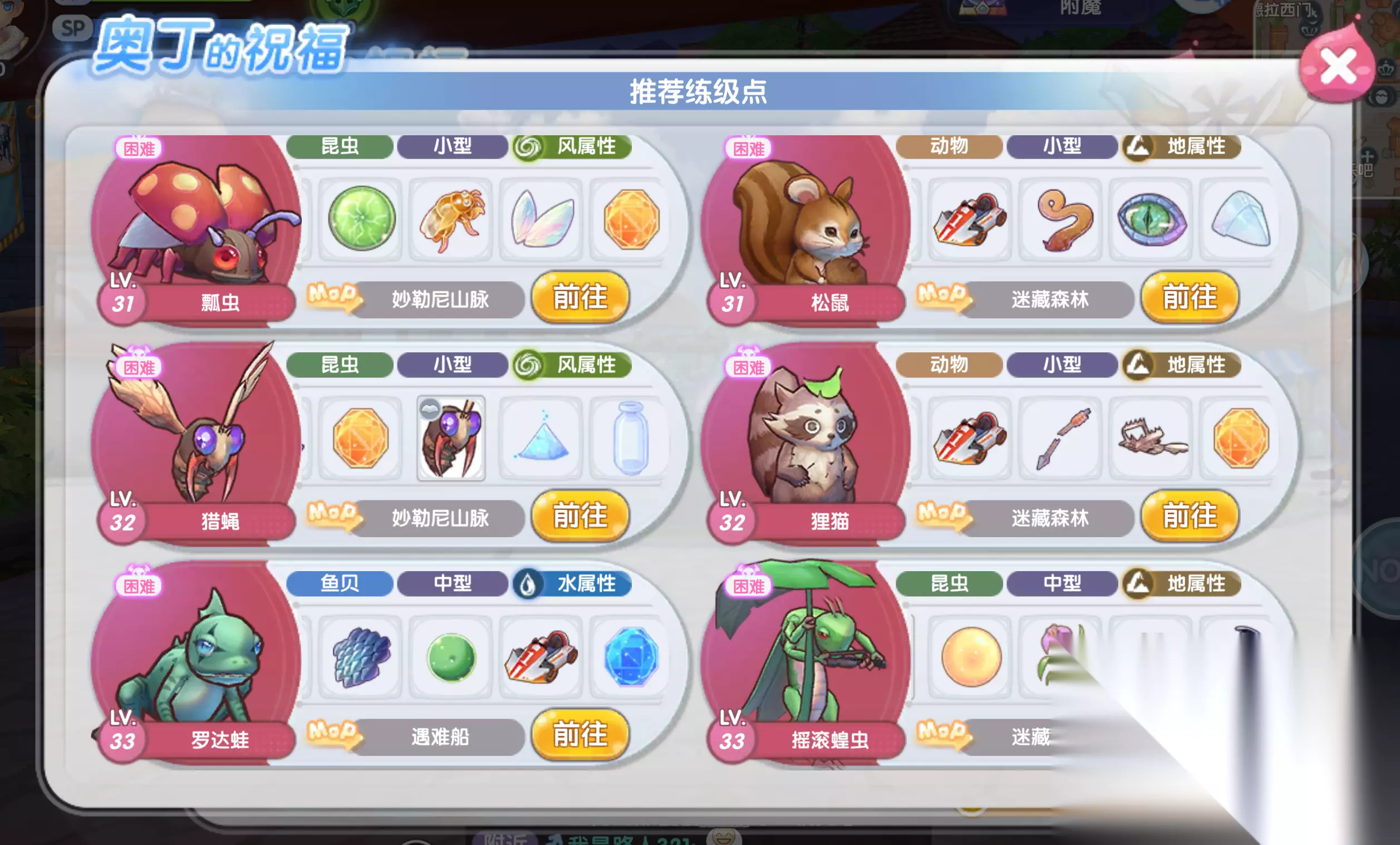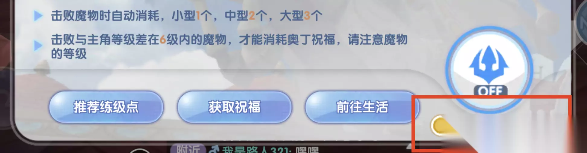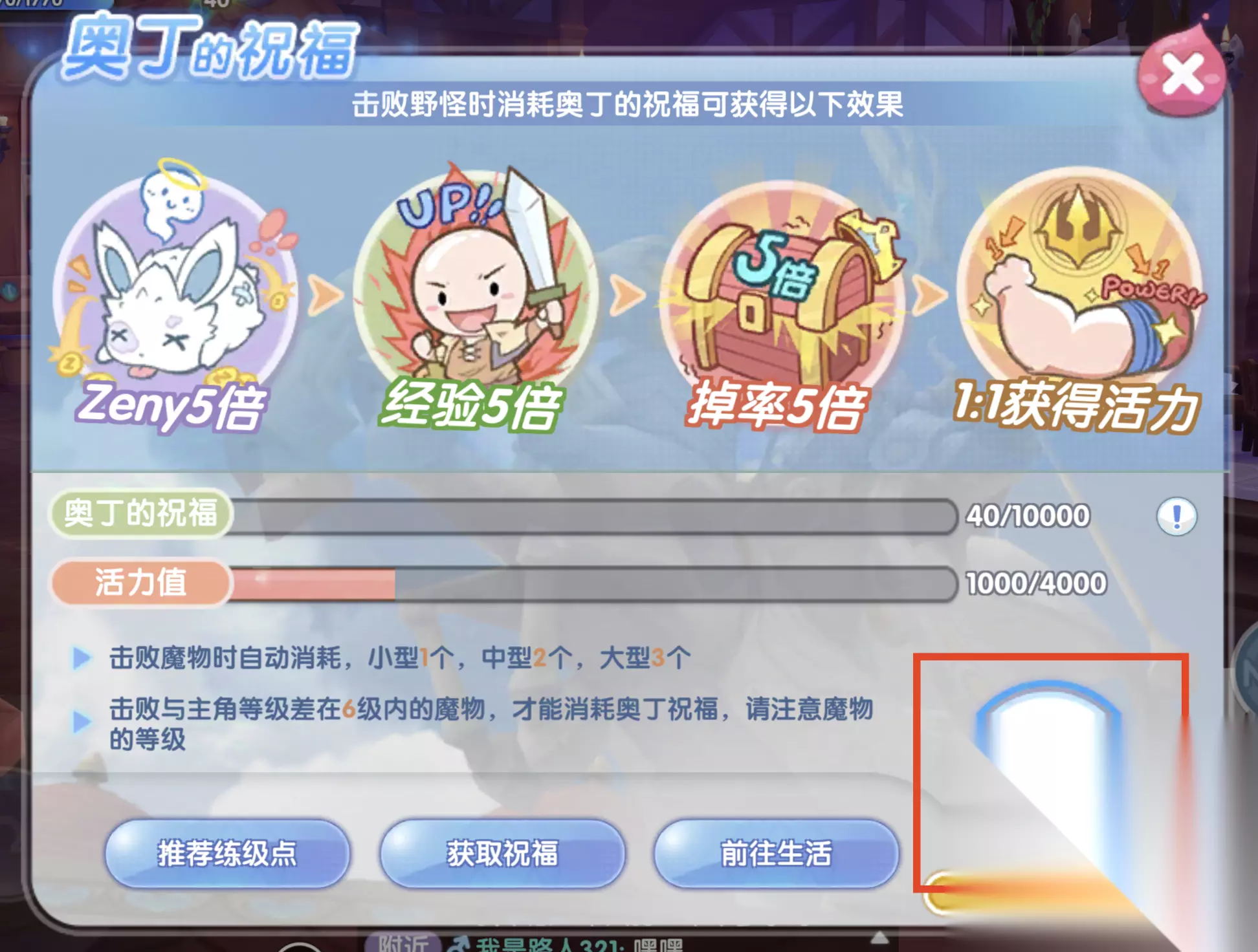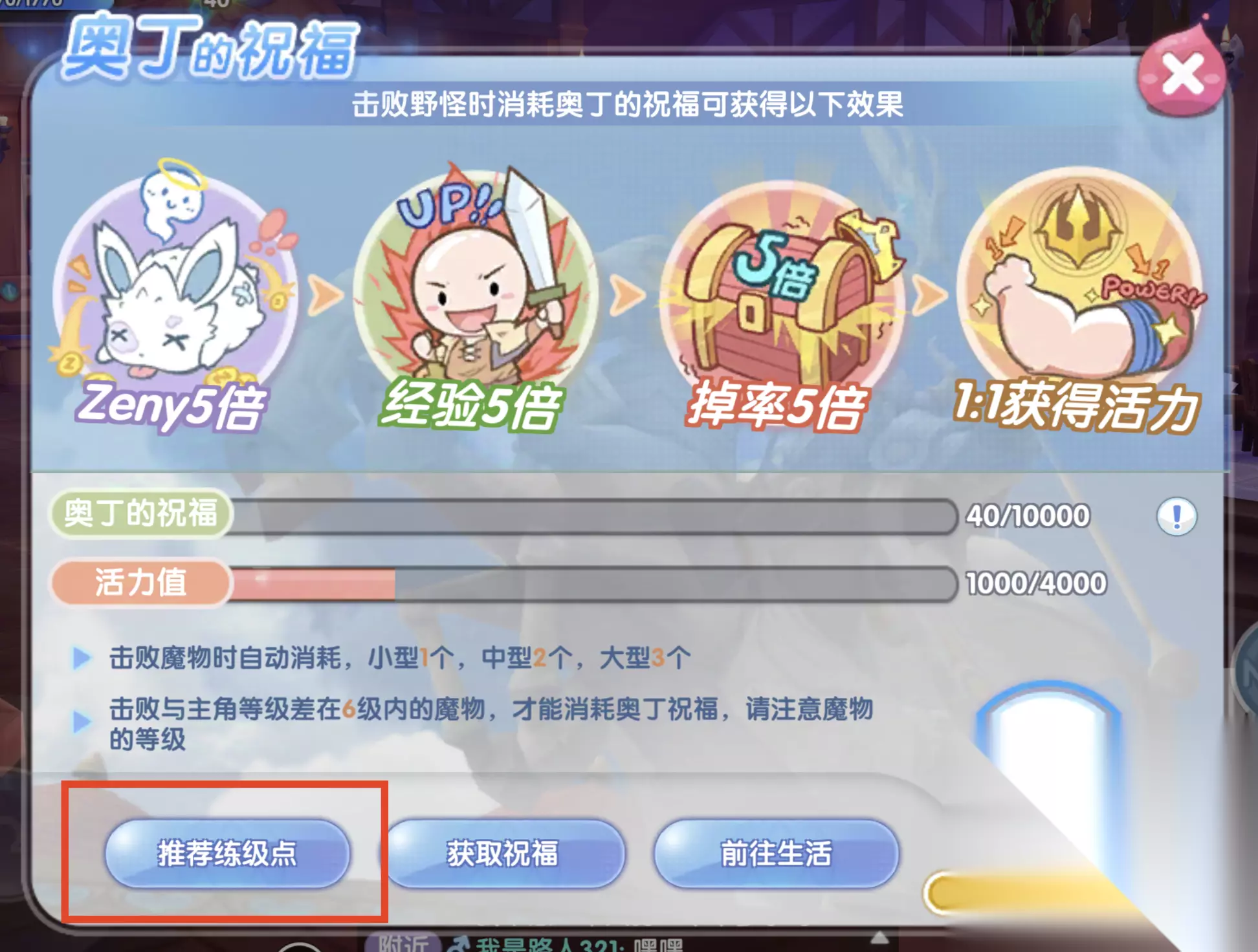 (2)只有击败与人物Base等级差在6级内的魔物时,才能消耗奥丁的祝福,获得5倍Zeny、经验、掉落,并1:1获得活力。 如果不了解自己当前等级可以去哪里刷怪,可以在奥丁的祝福页面点击【推荐练级点】,根据自己的需求选择适合的魔物。