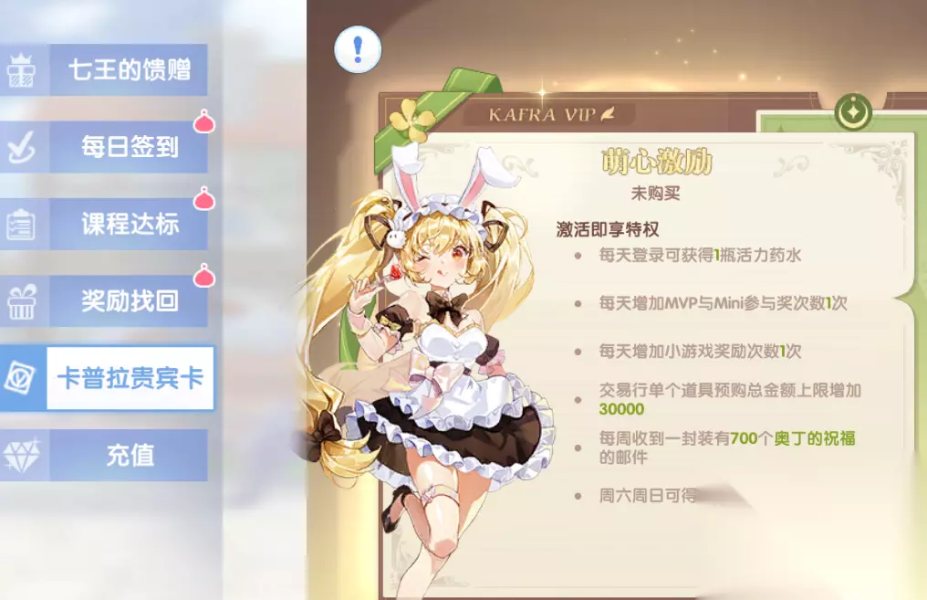 3、卡普拉贵宾卡——第三者有话说 拥有卡普拉贵宾卡后,每周都可以获得额外700点奥丁的祝福。要注意领取邮件的时候,奥丁的祝福尽量不要溢出。 另外,卡普拉贵宾卡还可以提高奥丁的祝福储存上限哦~