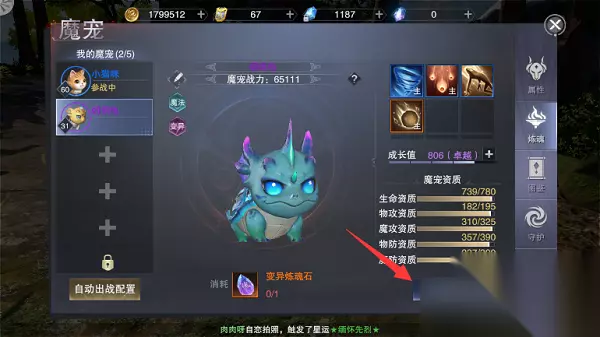 装备饰品:可以给魔宠装备武器、头盔、衣服、护符来增加魔宠的伤害。装备分别可以为魔宠增加物攻或魔攻,物防或魔防,生命和技能,综合提升魔宠的总体实力。 魔宠饰品获得:交易行、锻造、制皮等方式均可获得。 炼魂栏:通过“炼魂石”可以进行宠物炼魂提升魔宠资质,每次对魔宠进行炼魂必定会提升摸宠的战力。而且每次炼魂还有记录获得变异摸宠,当炼魂次数达到一定次数之后魔宠必定发生变异,变异后的魔宠在攻击力和资质上都会都大幅度的提升,变异宠物炼魂时每次炼魂都要消耗“变异炼魂石”。