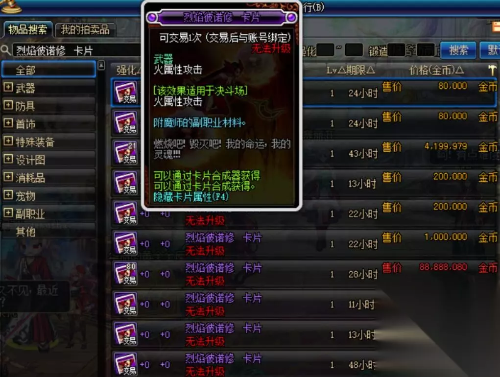正所谓:物以稀为贵。在早期的DNF游戏中,装备附魔都是土豪才能用得起,有时候一张紫色卡片就能卖出天价。而要说到DNF60版本最强的附魔卡片,非“烈焰彼诺修”莫属,这张卡片可以让给武器附加火属性攻击,在那个属性攻击武器屈指可数的年代,火女卡受到了很多玩家的追捧,价格自然也是水涨船高。