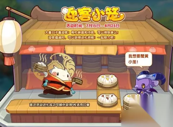 4.迎客小笼 大喜日子喜迎客!帮助擀面和待客,可以得到承认!迎客值满时,可以获得进化资格!一起努力吧! 重要提示:上阶宠物的获得需要到VIP专属场景的云隐鹤山进行战斗概率刷出捕捉获得。由于会自然进化,千万要注意不能是进化后的形态哦!进化等级会保留至进化后的哈! 活动时间:7月15日-8月25日 活动地图:商店街