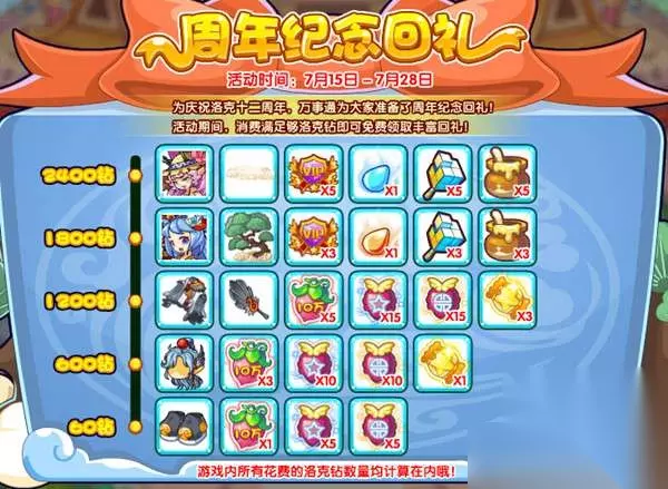 11.周年纪念回礼 为庆祝洛克十二周年,万事通为大家准备了周年纪念回礼!活动期间,消费满足够洛克钻即可免费领取丰富回礼! 活动时间:7月15日-7月28日 活动地图:商店街 活动获得:福熙水灵,盛夏蝶后,云中君套装,培养果实等