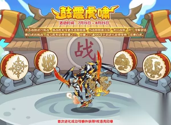 2.鼓震虎啸 点击战鼓进行挑战,挑战胜利可更改战鼓鼓面,当战鼓鼓面出现“虎印战鼓”时,可解锁惩祟白虎的挑战,战斗胜利获得觉醒之力。觉醒之力满100可开启进化获得宠物:惩祟白虎。 活动时间:7月15日-8月25日 活动地图:巨石阵 活动获得:惩祟白虎,洛克印章