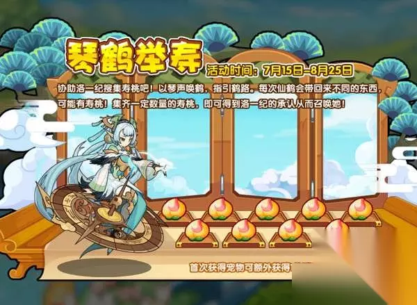 3.琴鹤举寿 协助洛一纪搜集寿桃吧!以琴声唤鹤,指引鹤路。每次仙鹤会带回来不同的东西,可能有寿桃!集齐一定数量的寿桃,即可得到洛一纪的承认从而召唤她! 活动时间:7月15日-8月25日 活动地图:云隐鹤山(非VIP版本) 活动获得:洛一纪,洛克印章