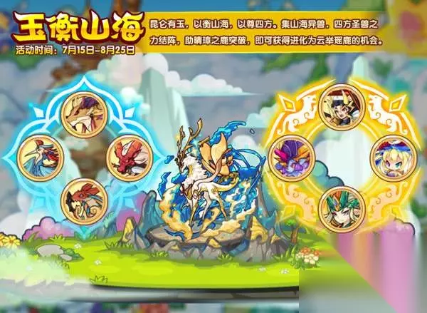 1.玉衡山海 昆仑有玉,以衡山海,以尊四方。集山海异兽,四方圣兽之力结阵,助晴璋之鹿突破,即可获得进化为云举瑶鹿的机会。 活动时间:7月15日-8月25日 活动地图:沐芳之境 活动获得:云举瑶鹿
