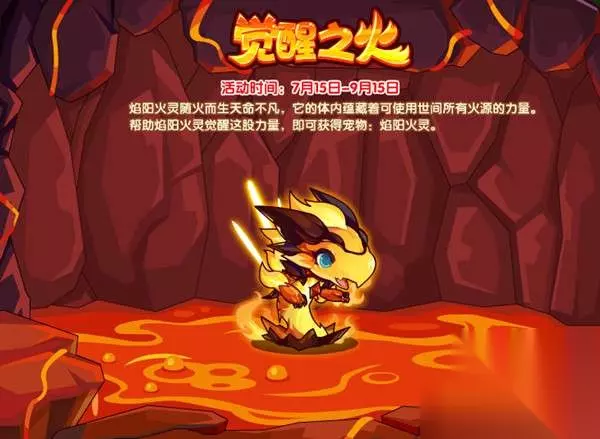 7.觉醒之火 焰阳火灵随火而生天命不凡,它的体内蕴藏着可使用世间所有火源的力量。帮助焰阳火灵觉醒这股力量,即可获得宠物:焰阳火灵。 活动时间:7月15日-9月15日 活动地图:苍炎界碑 活动获得:焰阳火灵