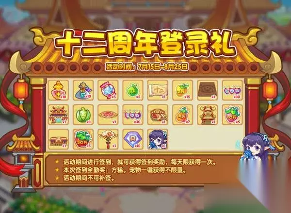 6.十二周年登录礼 活动期间登录签到,即可获得各种奖励,其中还包含十二周年纪念家具以及B站魔方工作室官方号联动特备宠物:方糕哦! 活动时间:7月15日-8月25日 活动地图:彼得大道 活动获得:方糕,十二周年纪念家具,洛克钻,培养道具