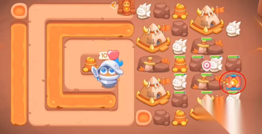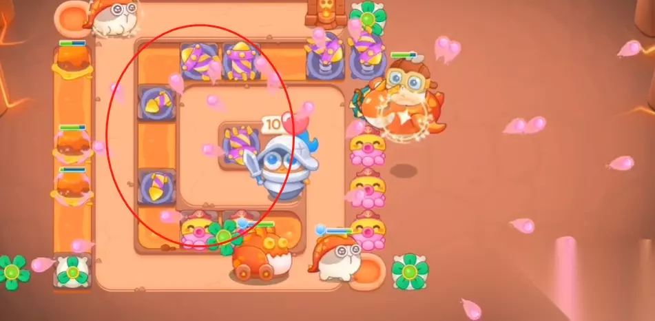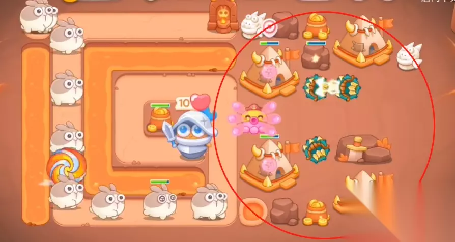 2、敌人会进入传送门过会出现,这种时候我们要快速布置防线,先将炮仗卖掉然后建造图中这些建筑并升级。