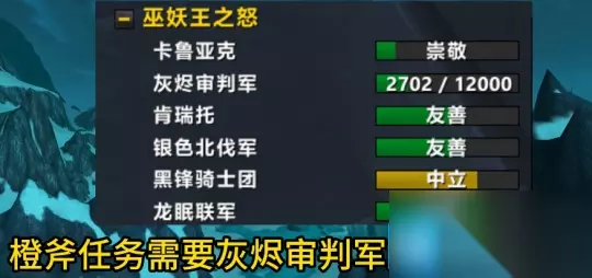 橙斧任务需要灰烬审判军的声望,达到友善。正常打到烂肠腐面前的话,声望肯定是够的,这时我们只要门口接任务即可。这里需要25个源生萨铁,不过天灾时可以换,现在拍卖行价格较高,如果嫌贵可以等等。