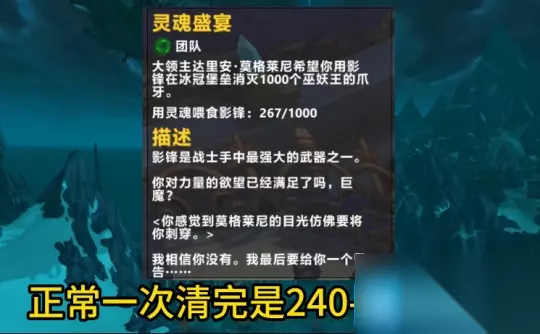 圣光的正义,只需要在这里做一个任务即可,剩下的烂肠腐面的血液,只要接到任务就会掉落。接下来一步的任务是千魂宴,千魂宴的话10人和25人均可以做,正常一次清完是240-260只怪,这里是我打一次10人的怪物击杀数量,所以在10人和25人都打的情况下,需要两周可以完成。如果你的团队在绿龙坐牢恭喜你,绿龙的小怪是计算在内的。