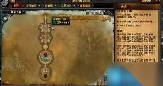 任务第四步完成橙斧三部曲任务之后你会接到“破碎的王座”这个任务,任务要求你收集50块影霜碎片。冰冠堡垒里的每个BOSS都有几率掉落1块,英雄难度的掉率要比普通难度的略高(好像只有25人的才会掉落)。