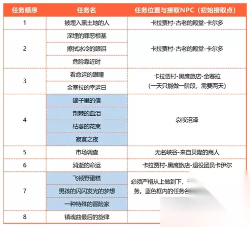 6、镇魂曲的最后旋律: 任务地点:费顿的卡拉贾村 获取方法:该任务将为复杂,请严格按照下图的任务顺序完成任务,该技能点任务至少需要两天才能完成;