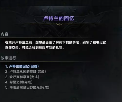 一、任务获取 1、降临到黑暗田野的光: 任务地点:卢特兰东部的卢特兰城 获取方法:在卢特兰城的卢特兰王宫与希里安对话接取,任务初始阶段名为“卢特兰的回忆”,为紫色任务,在跑完卢特兰主线后出现;