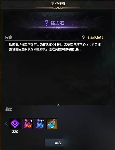 8、强力石: 任务地点:该任务位于寂静岛 获取方法:在刚上岛的地方和发光的破旧车轮互动可以接取到前置任务; 到达任务“强力石”阶段时,需要去一趟尤迪亚-萨兰德丘陵-莫拉伊遗迹副本,和托托克-沉默巨人之森-托托克体内副本(该副本不用通关,获取道具后就可以使用逃离之歌离去),随后完成任务即可获得技能点药水;