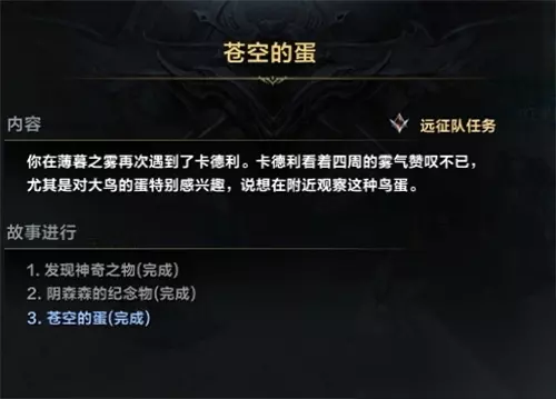 2、苍空的蛋: 任务地点:安忆谷的薄暮之雾 获取方法:任务是黄色连锁任务,共三个阶段,初始任务名称为“发现神奇之物”,二阶段在紫藤之丘,三阶段在薄暮之雾,建议在跑主线时一同完成;