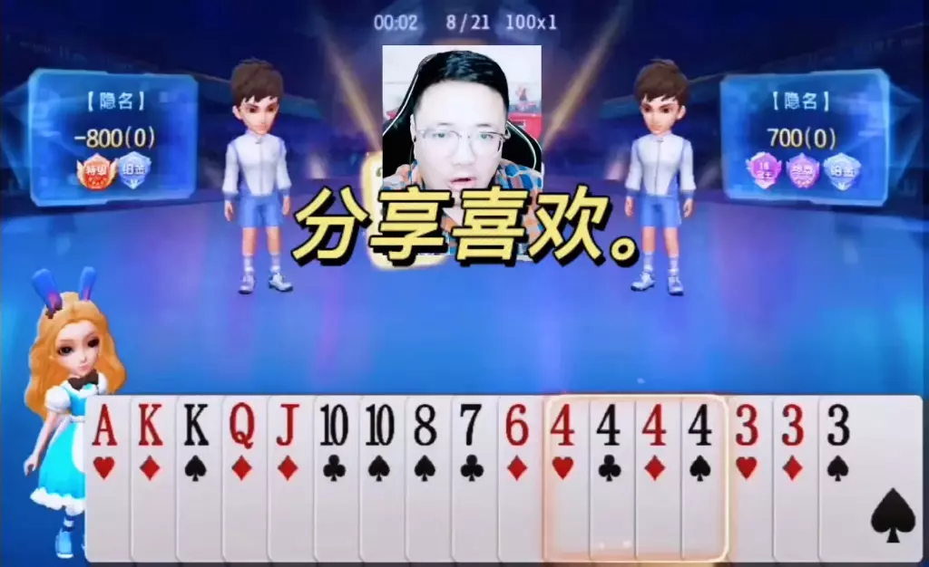 三岁玩牌破釜沉舟四个3的大胆一炸后期残局细腻的行牌为自己争取到了胜利!