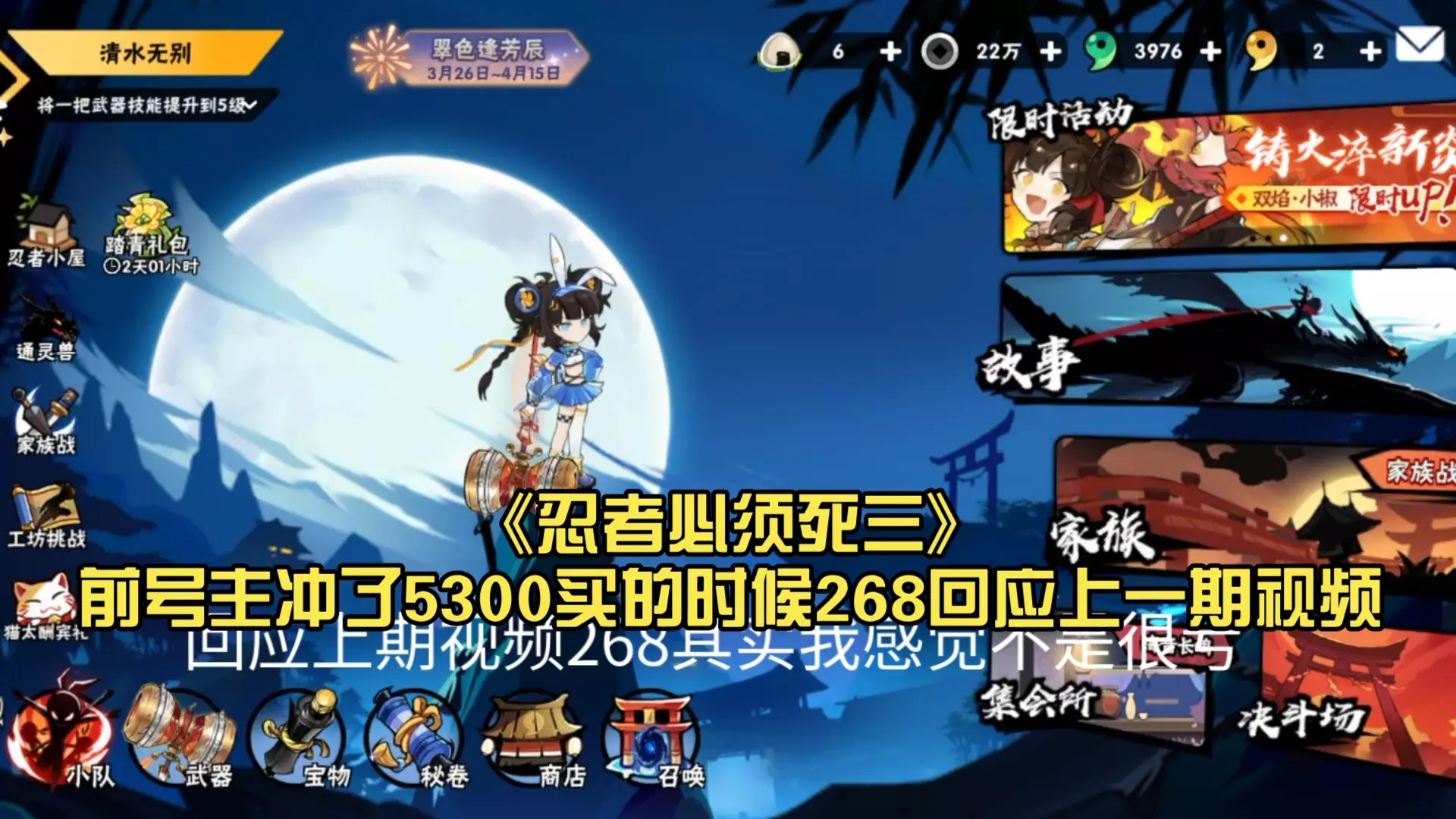 这是《忍者必须死3》的整活内容,吐槽游戏里的SS级宝物性价比低,比如SS面具仅加198面板,SS忍宗印法词条单一,开局仅加40%能量,不用这类宝物也能达成战斗效果,提醒玩家谨慎选择宝物。