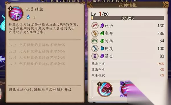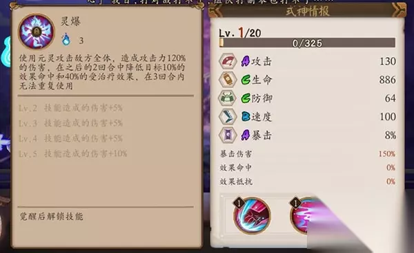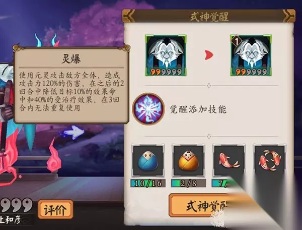 使用元灵攻击敌方全体造成攻击力120%的伤害,在之后的2回合中降低目标10%的效果命中和40%的受治疗效果,在3回合内无法重复使用。 阴阳师手游式神武士之灵觉醒图鉴