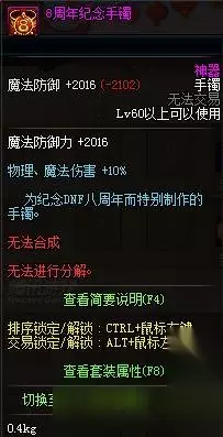 DNF8周年纪念手镯属性由233乐园小编给大家带来,8周年纪念手镯属性怎么样呢是不是和往年手镯的属性一样呢,8周年纪念手镯怎么获得呢,一起随小编来看看吧。 8周年纪念手镯属性 神器 魔法防御力+2016 物理、魔法伤害+10%