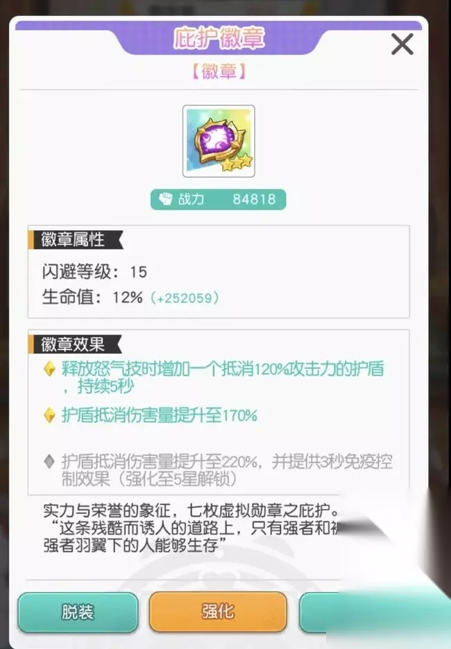 推荐远程减伤率提升。 二、神器 神器推荐用庇护徽章,加闪避、加生命、加护盾,极大增加了黄信的生存能力。
